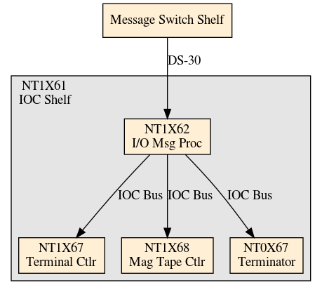 <imagemap> File:System_Overview_digraph_dms_dot.png rect 178 325 302 379 [[NT1X62]] rect 27 448 149 501 [[NT1X67]] poly 202 381 170 405 127 441 123 437 166 401 199 377 [[IOC Shelf Bus]] rect 168 403 235 424 [[IOC Shelf Bus]] rect 174 448 306 501 [[NT1X68]] poly 243 379 243 434 237 434 237 379 [[IOC Shelf Bus]] rect 240 403 307 424 [[IOC Shelf Bus]] rect 331 448 435 501 [[NT0X67]] poly 281 377 314 401 352 436 348 440 310 405 278 381 [[IOC Shelf Bus]] rect 333 403 400 424 [[IOC Shelf Bus]] poly 243 195 243 311 237 311 237 195 [[DS-30]] rect 240 229 291 251 [[DS-30]] rect 370 144 497 197 [[NT6X17]] rect 16 261 445 512 [[NT1X61]] rect 356 80 512 208 [[NT6X05]] rect 345 16 523 219 [[NT6X04]]</imagemap>